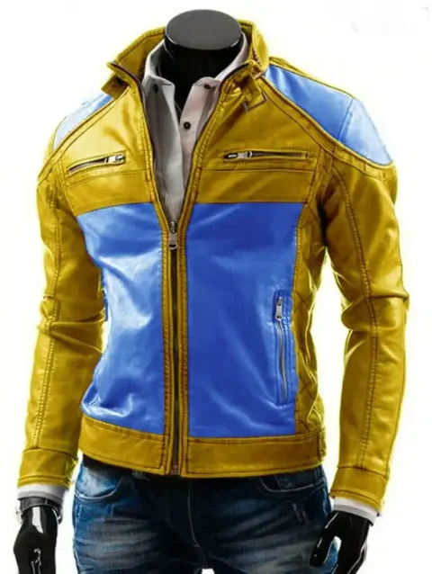 Yellow and Blue Slim fit Biker Leather Jacket for Men
